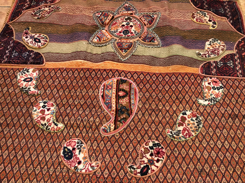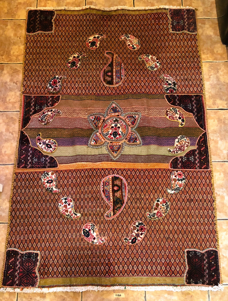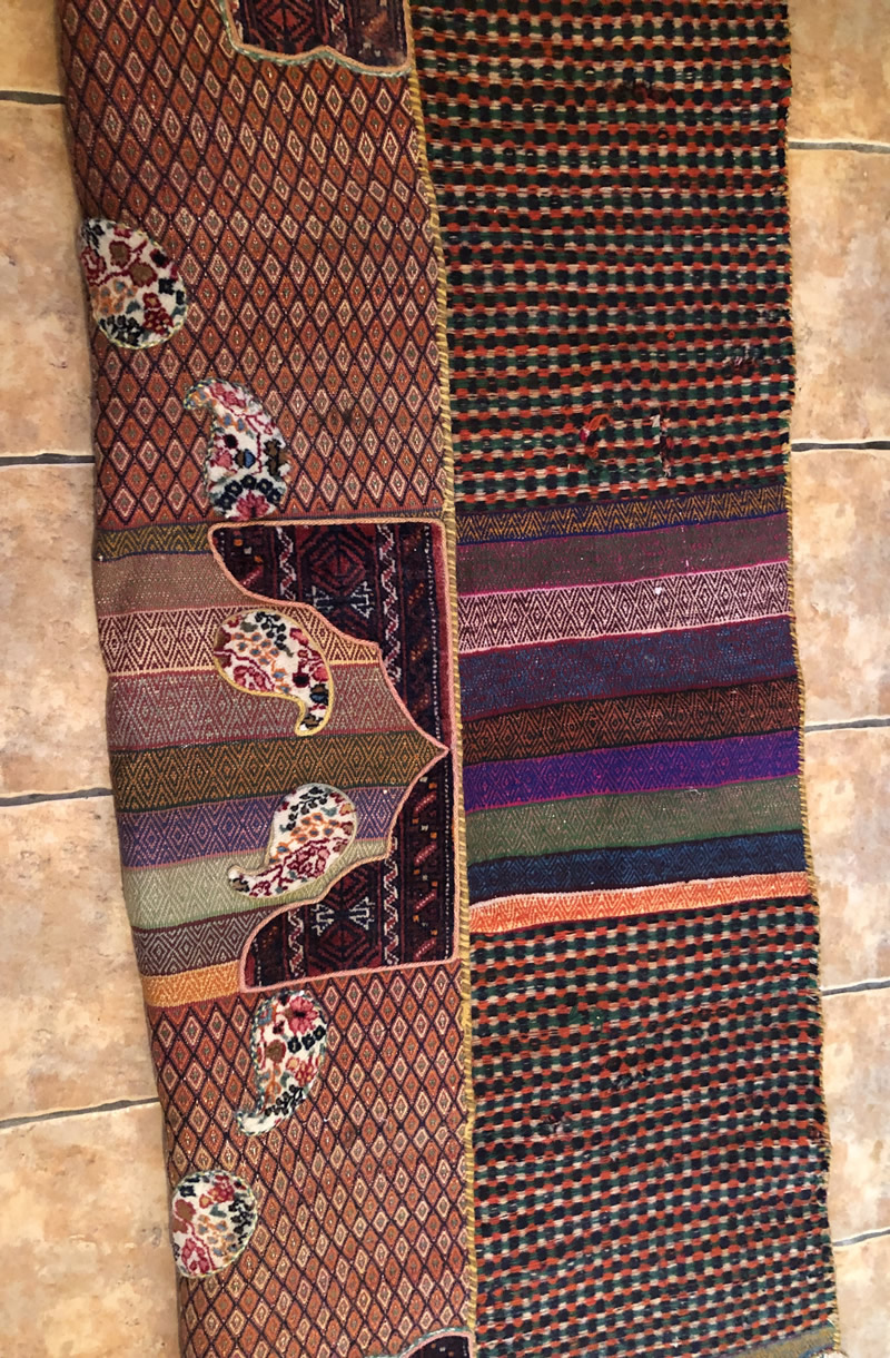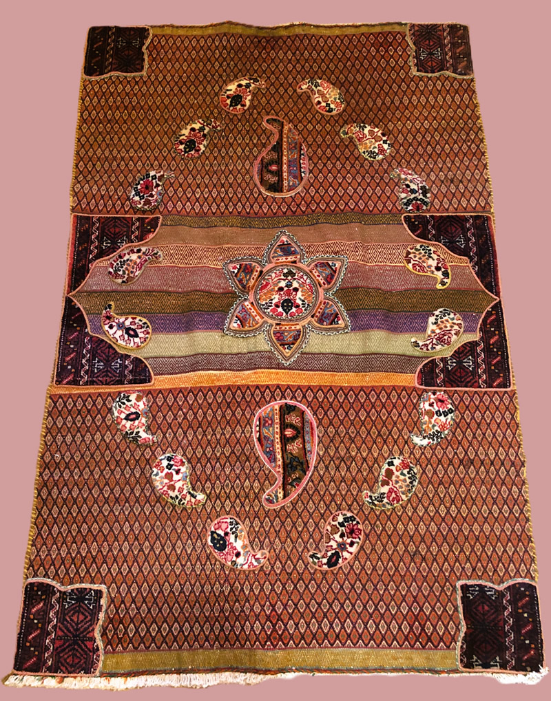 + Free delivery | UK only | Allow 5-7 daysGood condition. Short strigs (fringed) on width. Rugs with boteh jegheh (paisley pattern) and other Persian patterns attached on Suzani kilim.